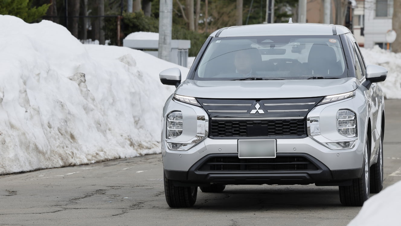 脇に雪が残る道を走る『アウトランダーPHEV』