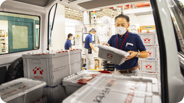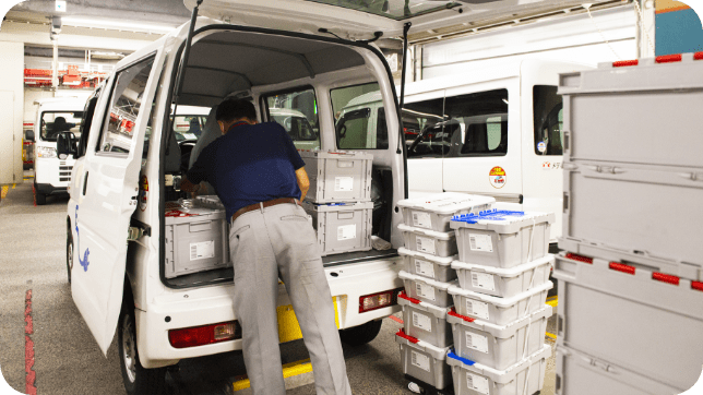 私たち東京中央FLCでは都内100km圏内の地域に医薬品などを配送しています。現在、63台(2022年9月現在)の配送車がありますが、そのうちの2台が『ミニキャブ・ミーブ』です。ドライバーには8時出勤と10時出勤のグループがあり、それぞれ決められたルートを2周します。1周するのに2時間半ほどかかり、1日の走行距離は30kmほどになります。
