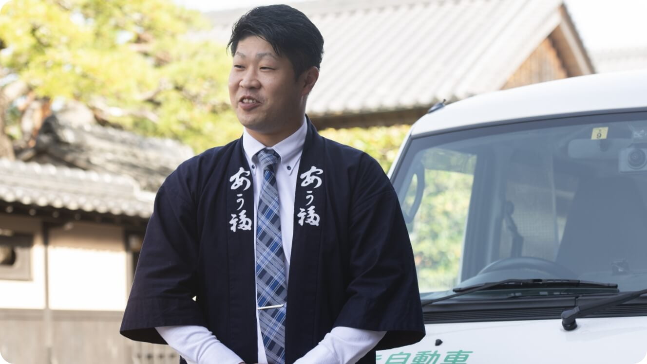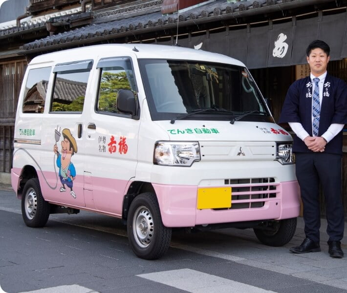 伊勢神宮内宮の宇治橋前から続く「おはらい町」周辺の直営店、委託店に商品を納品する際などに使用しています。赤福餅はとてもデリケートな商品。運搬する際にも型崩れしないように細心の注意を払わなければなりません。ガソリン車の時にはエンジンがかかる時などにガタンという振動を感じることがありましたが、『ミニキャブ・ミーブ』ではそれがなく、お菓子が守られているように感じられ、商品を運ぶのにとても適していると思っています。