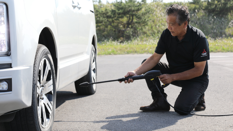 ラフロード走行を行うと、クルマの下回りに砂や泥がこびりつき、時間が経過すると落ちにくくなってしまいます。クルマの下回り、タイヤハウスの中は特に念入りに洗い流しましょう。理想は、高圧洗浄機による洗浄ガンを使用すること、それがなければホースの先をつまんで水圧をかけるとよいでしょう。