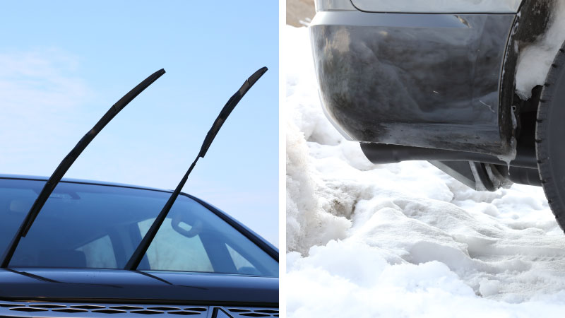 凍ったワイパーがフロントウィンドウに貼り付いてしまうことがあります。ワイパーアームを 立てた状態にしましょう。ただし、夜間に降雪の予想が出ている場合は、雪質にもよりますが、雪の重みでワイパーを破損する場合があります。天気予報に気をつけましょう。