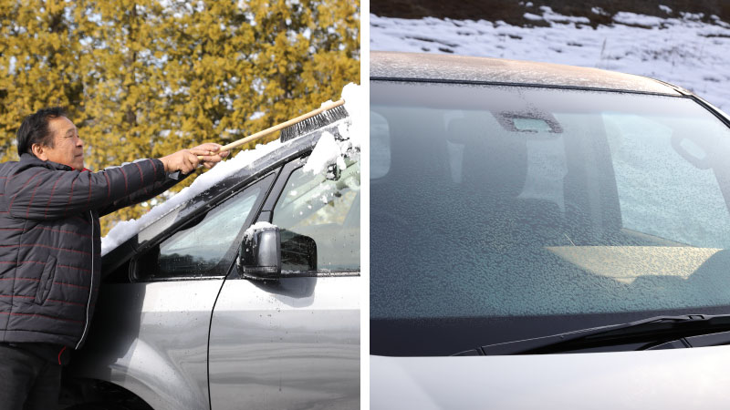 寒冷地では、朝にクルマを動かそうとすると、フロントウィンドウが凍結していることがほとんどです。もちろん、そのまま走行することは大変危険ですし、ワイパーを動かしても解氷で きないことがほとんどです。解氷する手段としては、エアコンの吹き出しをデフロスターにして、ゆっくりと溶かしていくこと。ある程度溶けてくると、ワイパーを使って解氷することができます。ただし、解氷までに時間を要しますので、朝の出発時間に必ず余裕を持っておきましょう。すぐに解氷したい場合は、解氷スプレーを使用しましょう。商品によっては、再凍結を防止してくれるものもあり、とても便利です。ちなみに、解氷をする際に決してやってはいけないのは「熱湯をかける」こと。急な温度変化によって、ウィンドウを損傷することがあります。解氷の際には、熱湯ではなく、ぬるま湯を 使用しましょう。