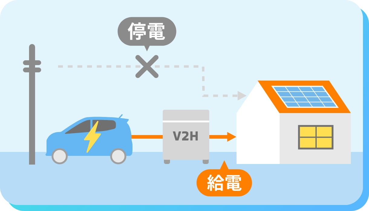停電などの非常時にも、電気自動車に蓄電した電力を家に供給することができるので、いざというときの備えとして安心です。