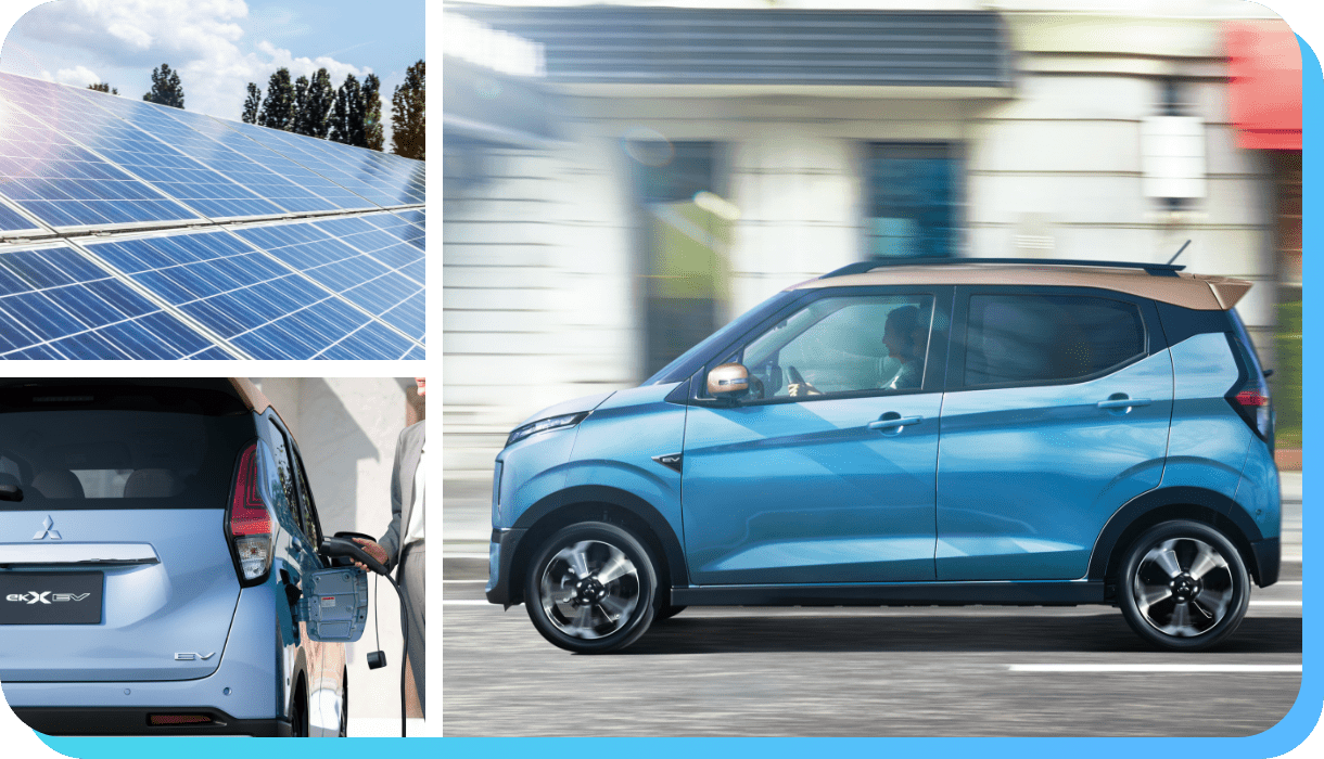 日中に太陽光発電した電力をeKクロス EVに充電して、走行できます。電気自動車なので、走行中のCO2の排出がないのはもちろんのこと、太陽光で発電した再生可能エネルギーを使用するので環境にやさしいです。
