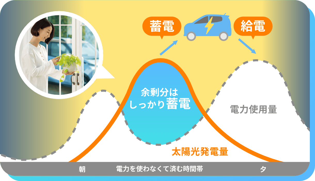 太陽光パネルで発電した電力のうち、家の中の家電や照明で使用しきれなかった、余った電力をeKクロス EVのEVバッテリーに蓄電。日没後の使用に向けて電力を貯めておけます。