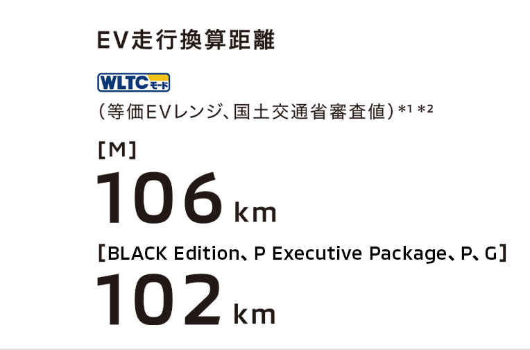 EV走行距離は、定められた試験条件のもとでの値です。実際にはお客様の使用環境(気象、渋滞等)や運転方法(急発進、エアコン使用等)に応じて燃料消費率は大きく異なります。とくに1日当たりの走行距離、バッテリーの充電状態、エアコン使用による影響を大きく受けます。…