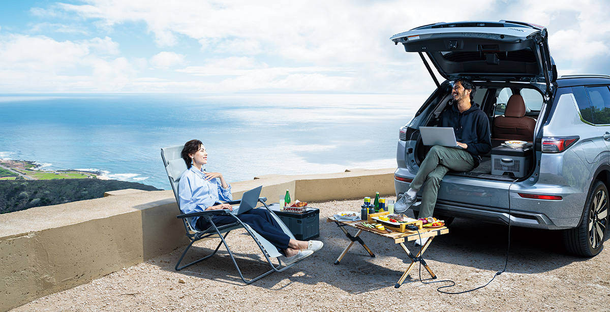 アウトランダーのもうひとつの側面、それは“移動する電源”でもあること。外出先でも、さまざまな電化製品が利用可能です。さらに蓄えた電気はご自宅で使うこともでき、エンジンでの発電も組み合わせれば、ガソリン満タンで最大約11日分の電力量が供給できます。
