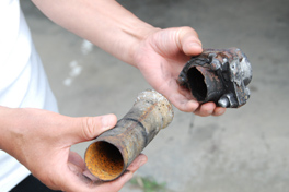 そう言ってガレージの奥から取り出してきてくれたのは、マフラーとエキゾーストパイプのつなぎ目部分だ。サビとススで真っ黒になっている。本来はつなぎ合わさっていたが、購入から20年を経て、折れてしまった。伊藤さんは、その代わりに細長いパイプを挿入して両者をつなぎ、コーキング剤を塗り盛って修理した。