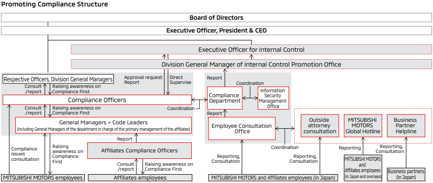 At MITSUBISHI MOTORS Group, we have established a compliance framework with the Executive Officer for Internal Control as the person responsible, overseeing, directing, and supervising all compliance activities. This officer also reports regularly to the Board of Directors on the status of compliance activities. In addition, each division appoints a compliance officer, and department heads serving as code leaders, to ensure a structured compliance system across the Company.