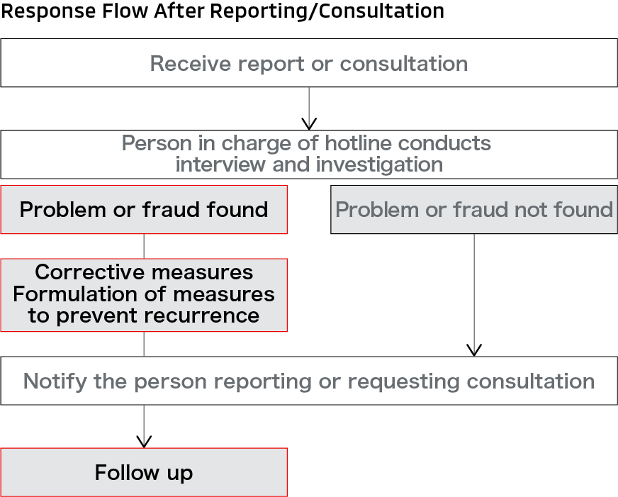In case these regulations or standards are violated, a system is in place for internal reporting and the formulation and implementation of measures to prevent recurrence.