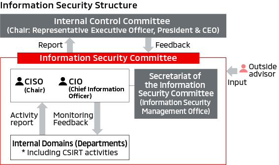 MITSUBISHI MOTORS have established the Information Security Committee, chaired by the Chief Information Security Officer (CISO), as a subordinate body under the Internal Control Committee. This committee determines key matters and policies related to information security management and monitors information security activities. Outside advisors also participate in the committee, allowing us to incorporate outside perspectives and further enhance our information security efforts.