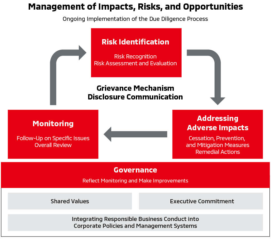 MITSUBISHI MOTORS is committed to identifying potential adverse human rights impacts associated with its business activities through a human rights due diligence framework and to preventing or mitigating such impacts.These efforts are based on the OECD Due Diligence Guidance for Responsible Business Conduct (hereinafter referred to as the OECD Guidance) issued by the Organization for Economic Co-operation and Development (OECD). By continuously implementing these measures, MITSUBISHI MOTORS strives to build a more sustainable supply chain by addressing the social and environmental risks associated with our business activities.