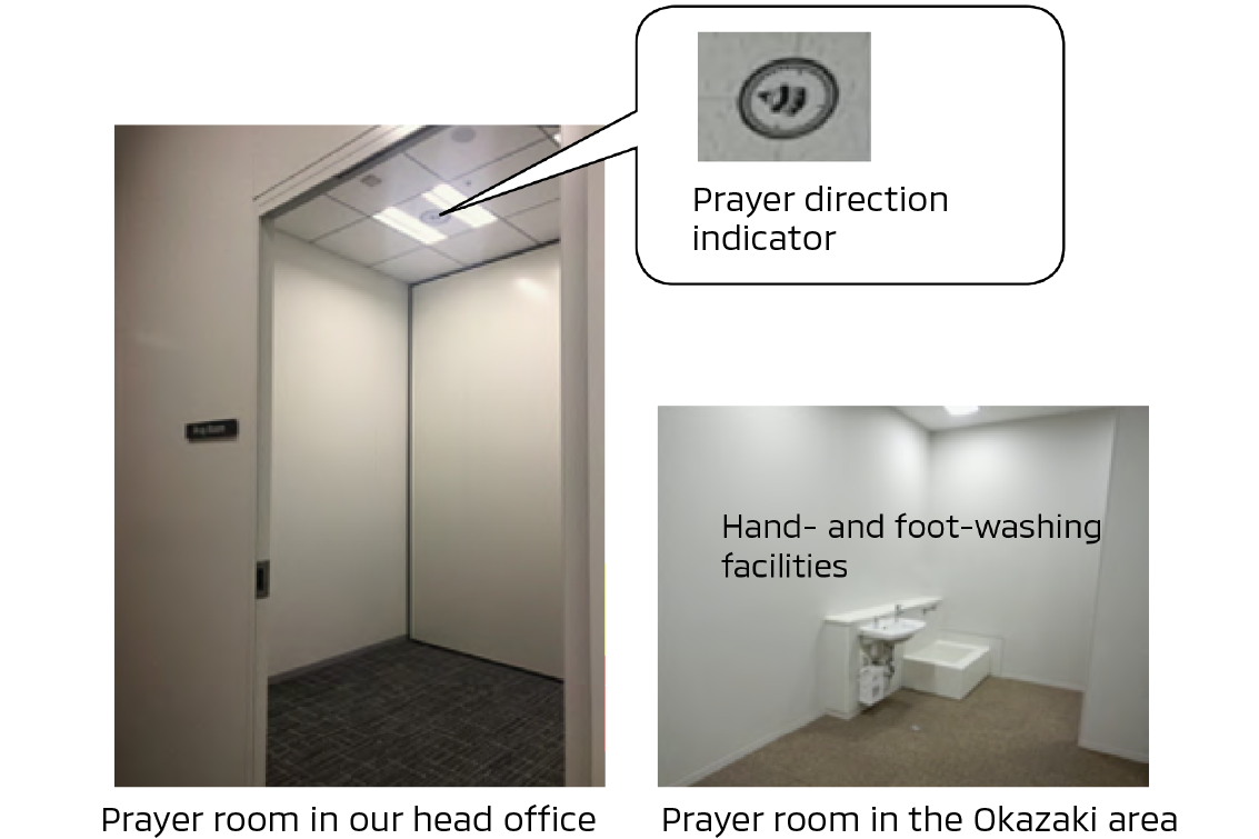 As part of the support offered to our workforce of non-Japanese employees, which is increasing year by year, we have established prayer rooms at our head office and Okazaki sites that are available to people of all religions and denominations. These rooms are open to customers, suppliers and other stakeholders who visit our sites. A facility for cleansing parts of the body before worship has also been set up in the prayer room at the Okazaki site.