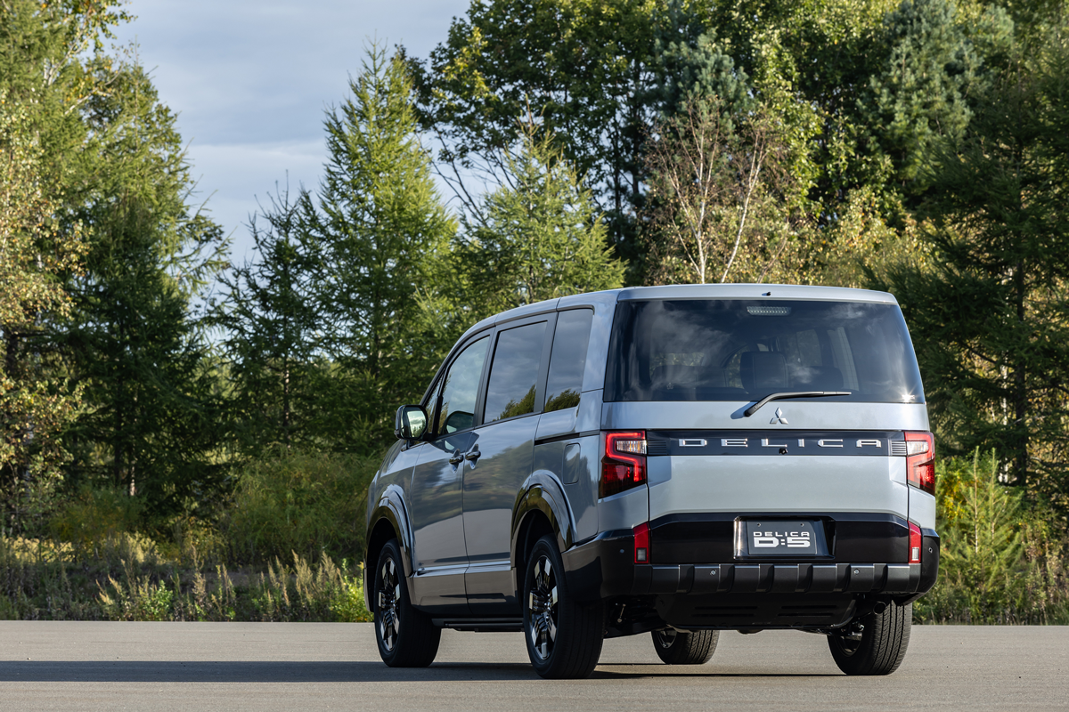 フロントグリルとフロントバンパー、リヤバンパーをシンプルで立体感のある力強いデザインとし、リヤゲートでは、「DELICA」ロゴをガーニッシュ内へ取込むことで、リヤゲートパネルをよりシンプルでプレミアム感のあるデザインへと変更。また、ボディサイドにはワイドで安定感のある足回りと高い走破性を想起させる新採用のホイールアーチモールに加え、力強さを強調しギア感を高めた新デザインの18インチアルミホイールを採用しました。