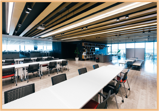 カフェテリアでは、コーヒーやパンなどの軽食を販売しています。お昼にはお弁当を食べたり、その他の時間帯は仕事スペースとして利用することも可能。地上25Fに位置する広々としたスペースは、見晴らしもよく社員のリラックス空間となっています。