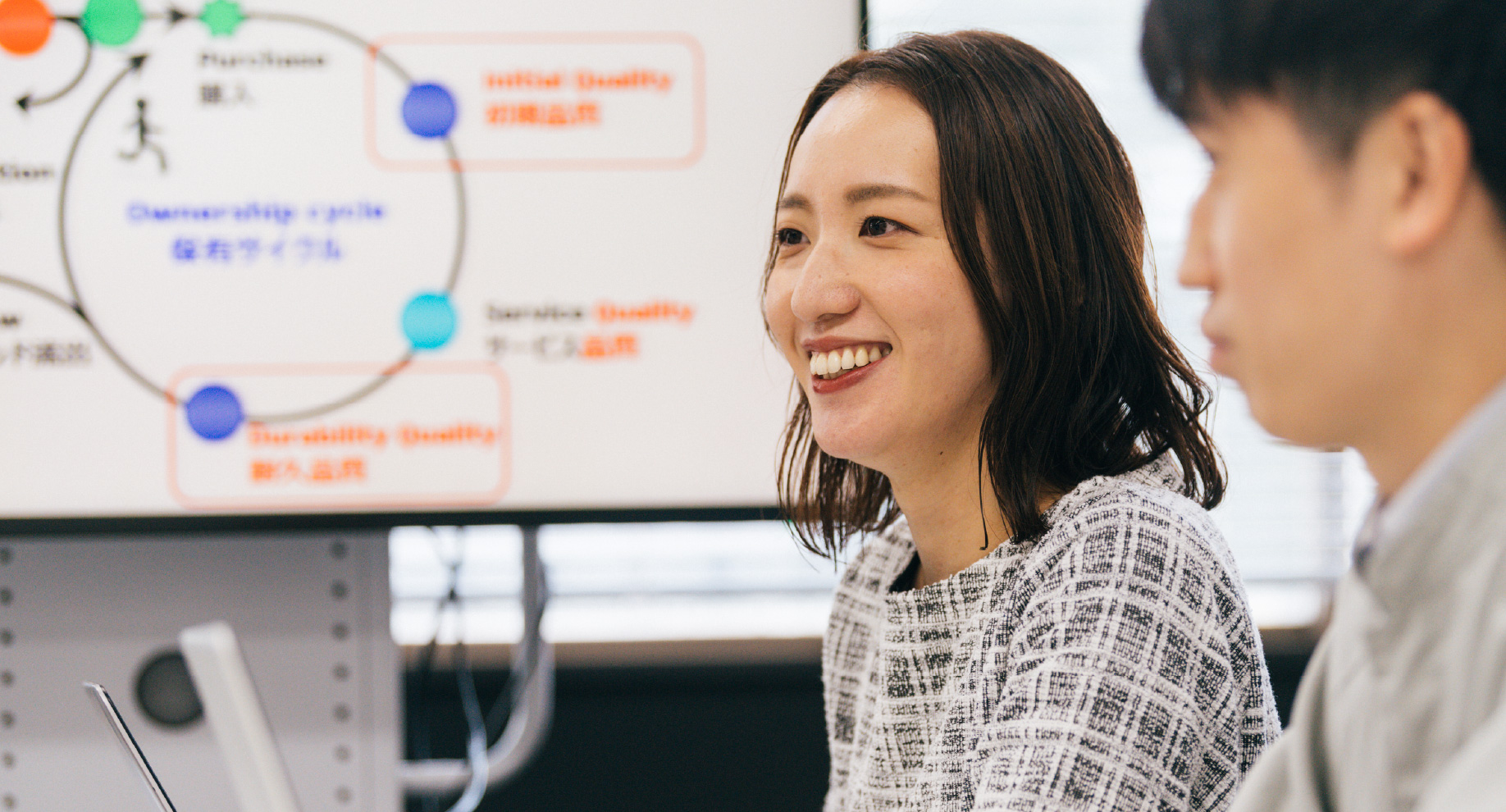 以前は、福井県にあるメガネの金属加工会社で働いていました。学生時代からお付き合いしていた彼との結婚を機に岡崎市に引っ越すことになり、転職先を探すことに。その際、夫となった彼が、自分が勤めている三菱自動車を勧めてくれたのです。日頃から「とても良い会社だよ」という話を聞いていたこともあり、思い切って受けてみたところ、採用していただくことができました。入社してまず驚いたのは、社内の雰囲気です。もともと「三菱」と聞いて、古くて堅い会社をイメージしていましたが、まったくの逆。新しい分野にも積極的に取り組む風土がありますし、若手の意見も通りやすい職場でした。そうした風通しの良い環境の中、私は市場品質改善部に配属され、品質保証の業務にあたることになったのです。じつは、前職の金属加工会社でも品質保証に関わる業務は経験したことがあったのですが、自動車の品質保証はまるでレベルが違いましたね。部品だけでも何万点にも及び、その難易度、責任の重さも桁違いでした。