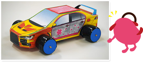 ペーパークラフトを作(つく)ったクルマにかぶせる時(とき)は、写真(しゃしん)の点線(てんせん)の位置(いち)で4つのタイヤ・ホイール部(ぶ)を切(き)ってね。