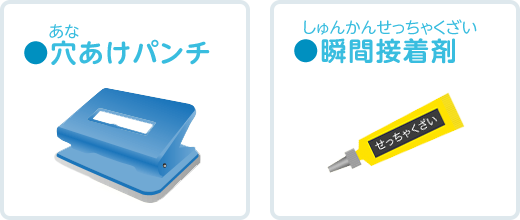 はさみやカッター、きりなどを使(つか)うときは、けがをしないよう注意(ちゅうい)しよう。 また、瞬間接着剤(しゅんかんせっちゃくざい)は手(て)についたり、目(め)にはいらないように注意(ちゅうい)してね。