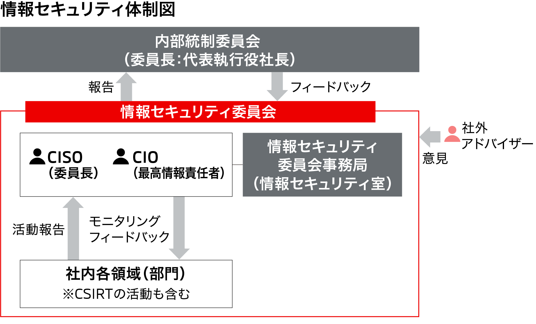 当社では、内部統制委員会の下部組織としてCISO(情報セキュリティ管理責任者)を委員長とする情報セキュリティ委員会を設置しています。同委員会は、情報セキュリティ管理に関する重要事項・方針を決定するとともに、情報セキュリティ活動をモニタリングします。また、同委員会には社外アドバイザーも参加しており、外部の意見も取り入れて情報セキュリティ活動のさらなる向上をめざしています。