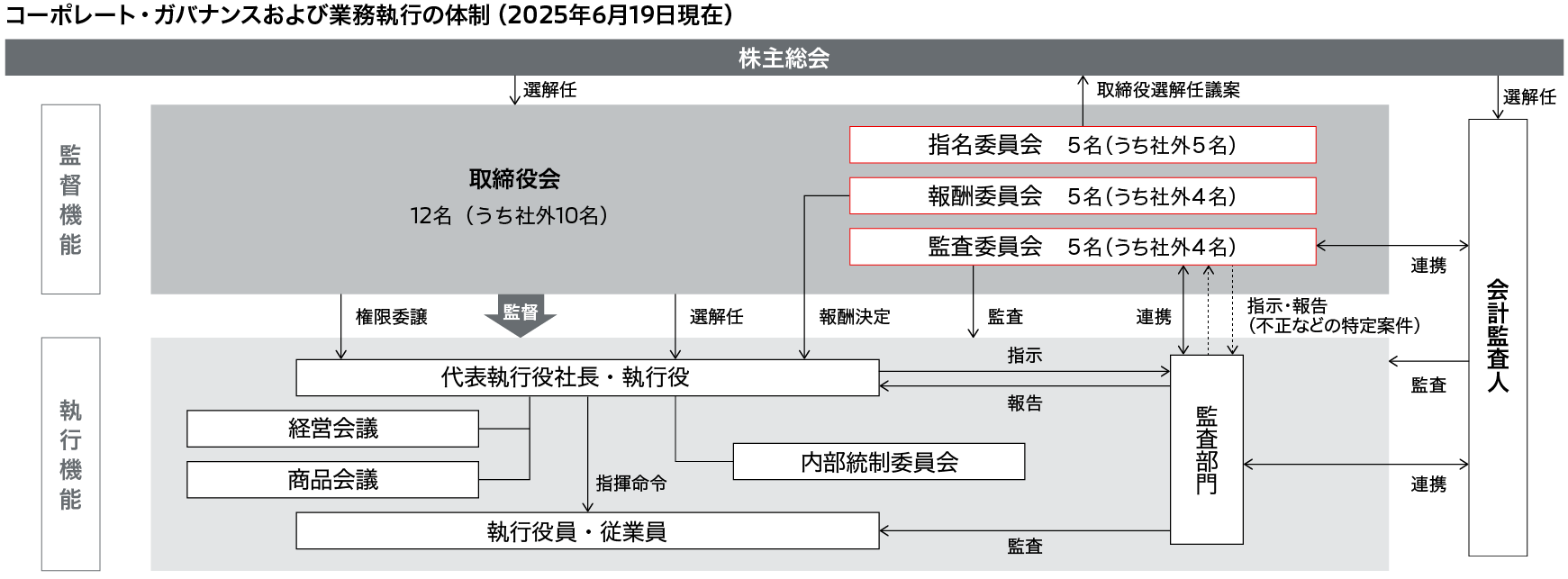 当社は、コーポレート・ガバナンスのさらなる強化の一環として、経営監督機能と業務執行機能の分離を明確にし、経営の健全性・透明性確保に向けて一層の監督強化および危機管理の徹底を図りつつ、環境変化に素早く対応する迅速な業務執行を実現していくために、指名委員会等設置会社の形態を採用しています。