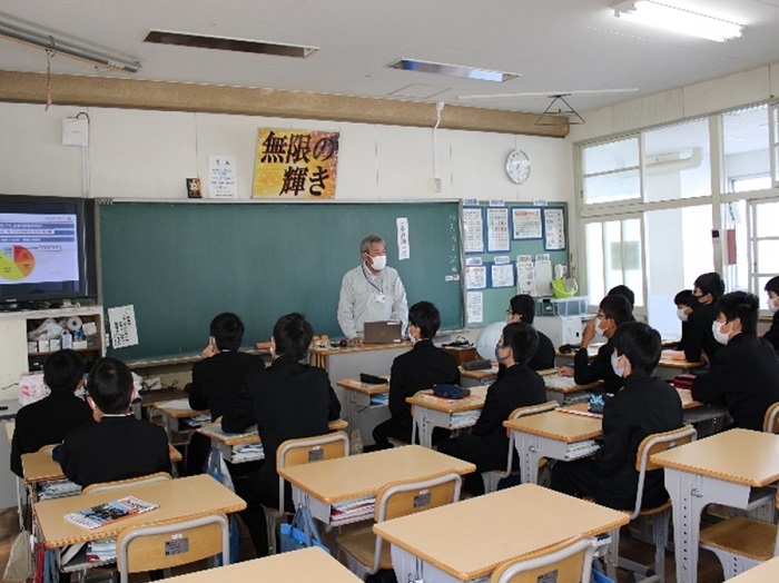 11月16日(火)、岡崎市立矢作北中学校で、将来について考える2年生を対象に、企業19社が各教室で講義を行う職業講話が行われ、当社からは安全実験部マネージャーの加納 宏明が職業講義をしました。三菱自動車の教室には29名の生徒が参加しました。