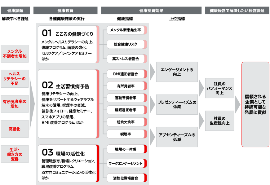 当社では健康経営を推進するにあたり、健康経営により解決したい経営課題を特定し、健康経営の戦略・ストーリーを明確にするべく、健康経営戦略マップを作成しています。健康経営戦略MAPでは、健康経営における施策の3本柱に、「こころの健康づくり」「職場の活性化」「生活習慣病予防」を掲げています。また、各種健康施策の有効性を評価するべく、健康指標をKPIとして設定のうえ、具体的な取り組みを実施し、施策の評価・改善を行っています。