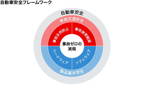 製品開発においては、安全理念に基づき、製品安全委員会にて安全開発指針・戦略とともに、安全技術の考え方として自動車安全フレームワークを策定し、以下の3点を軸として取り組んでいます。