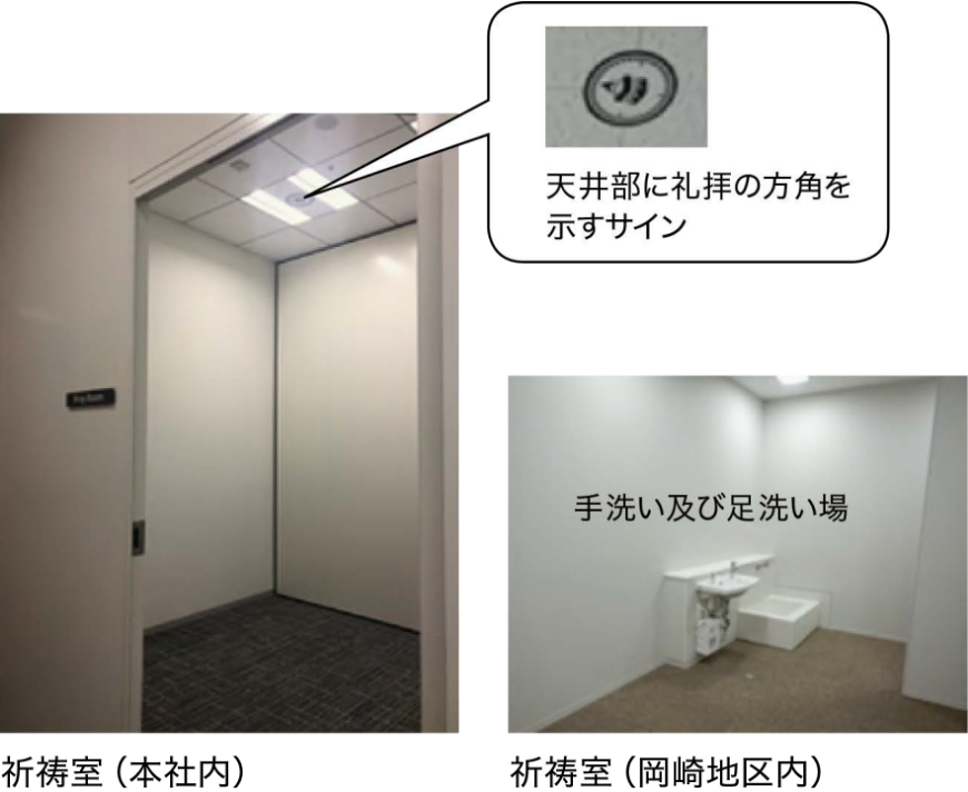 当社では、年々増加する外国籍従業員の受け入れ対応の一つとして、宗教・宗派を問わず利用可能な祈祷室を本社と岡崎地区の2拠点に設置しており、各拠点を訪問するお客様やサプライヤーなどのステークホルダーにも開放しています。岡崎地区の祈祷室には、礼拝前に身体を清めるための「小浄施設」も設置しています。